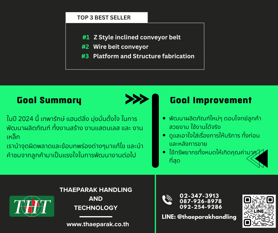 ในโอกาสขึ้นปีใหม่ 2024 นี้ เป็นอีก 1 ปีที่บริษัท เทพารักษ์ แฮนด์ลิ่ง แอนด์ เทคโนโลยี จำกัด ได้มีโอกาสทำงานให้กับโรงงานอุตสาหกรรมหลายแห่ง ทั้งในและต่างประเทศ ความสำเร็จ 25 ปีที่ผ่านมาของเรามาจากความพยายามร่วมกันของทีมงาน พัธมิตรที่สนับสนุน และลูกค้าของเรา เมื่อก้าวเข้าสู่ปีที่ 26 เรายังคงแน่วแน่ มุ่งมั่น สู่ความเป็นเลิศด้านเทคโนโลยีสายพานลำเลียงและงานขึ้นรูปสแตนเลสต่อไป