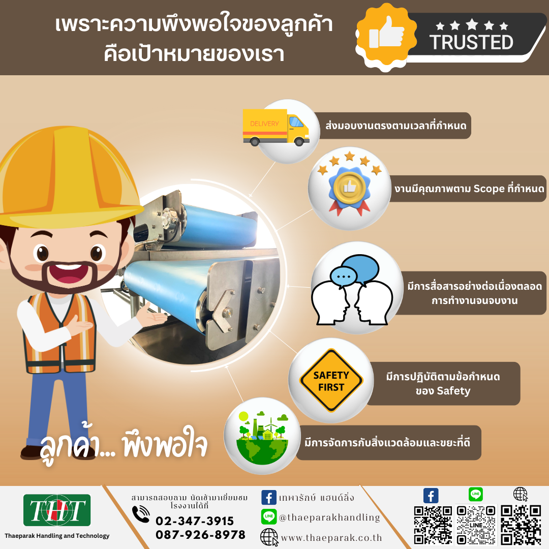 อยากให้งานจบ ต้องมาที่เทพารักษ์ แฮนด์ลิ่ง นี่คือประโยคที่ลูกค้าของเราแนะนำสินค้าและบริการของเราต่อๆกัน เพราะเรารับประกันเรื่องการจบงาน ส่งมอบงานตามกำหนด ตรงตามความต้องการของลูกค้าหมดกังวลเรื่องสายพานลำเลียงมีปัญหาหลังจากใช้งานแล้วได้เลย