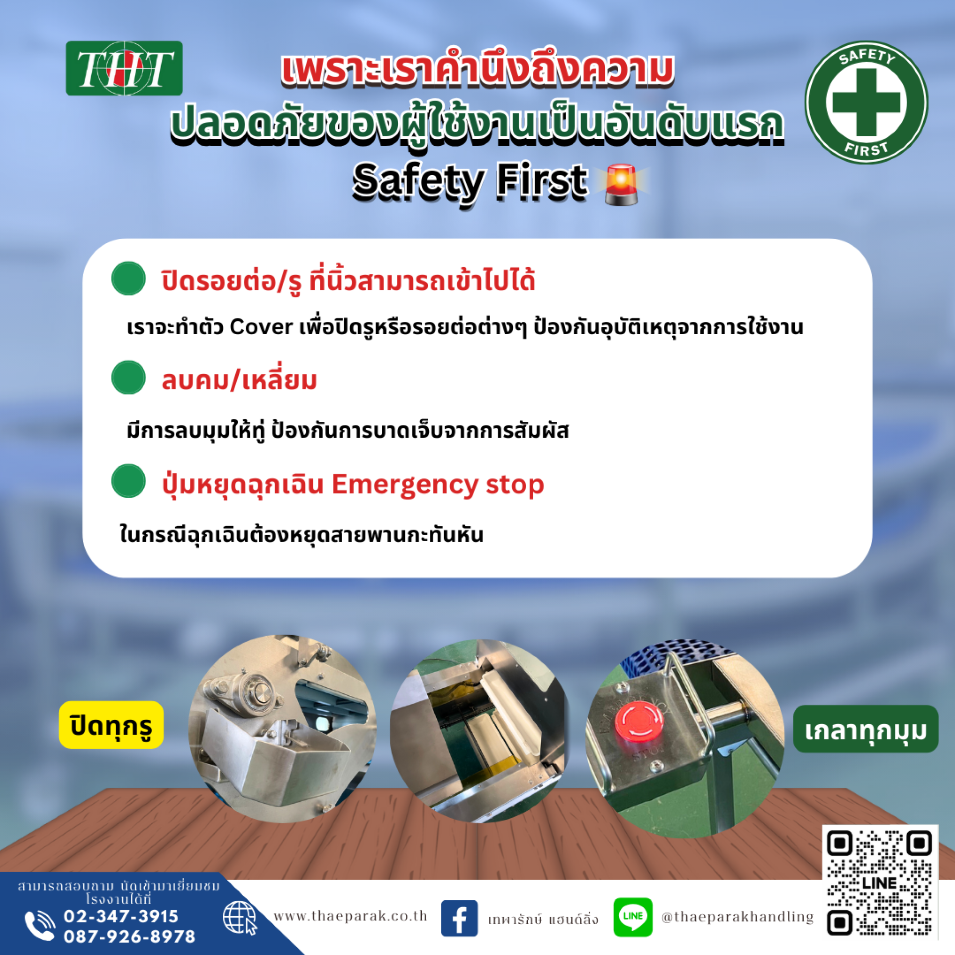 ด้วยการออกแบบจากวิศวกรออกแบบของเทพารักษ์ แฮนด์ลิ่ง เราจะคำนึงถึงความปลอดภัยในการใช้งานของผู้ใช้งานเป็นอันดับแรก ส่วนมุมแหละ ส่วนคม รู จุดต่อต่างๆ เราทำการปิดรอยเหล่านั้น เพื่อป้องกันอุบัติเหตุที่อาจเกิดขึ้นได้ จึงทำให้มั่นใจได้ว่า ระบบสายพานลำเลียงของเทพารักษ์ แฮนด์ลิ่ง มีประสิทธิภาพและความปลอดภัยสูงพร้อมรับทุกการใช้งาน