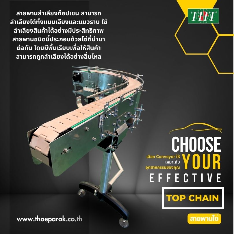 สายพานโซ่ (Top chain conveyor) เป็นระบบสายพานลำเลียงที่ใช้โซ่ด้านบนในการขนส่งสินค้า เหมาะสำหรับการลำเลียงสินค้าบนพื้นที่ที่ต้องการความเรียบหรือการลำเลียงที่ต้องการความต่อเนื่องสูง ใช้งานในอุตสาหกรรมที่หลากหลาย เช่น อุตสาหกรรมยานยนต์ อาหาร และการผลิตทั่วไป ด้วยความทนทานและการบำรุงรักษาที่ง่าย ระบบนี้ช่วยให้การขนส่งสินค้าเป็นไปอย่างราบรื่นและมีประสิทธิภาพ